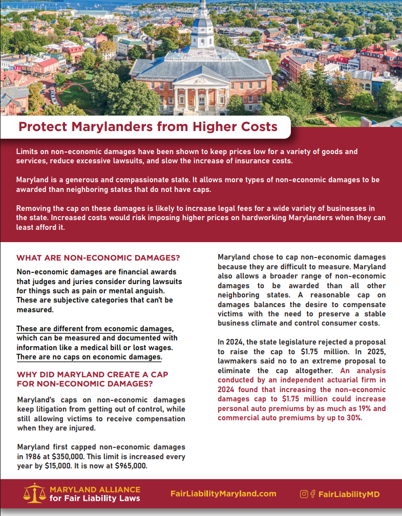 Dramatically raising or eliminating Maryland’s cap could increase both legal fees and insurance rates, making it more expensive for residents and businesses. That hurts Maryland at a time when the state can least afford it.